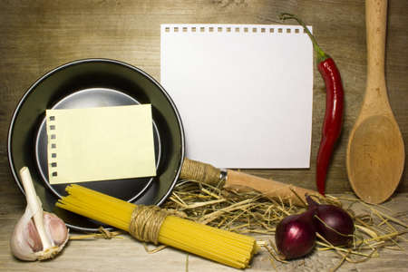 Wooden spoon, frying pan and a white sheet of paper on wooden background