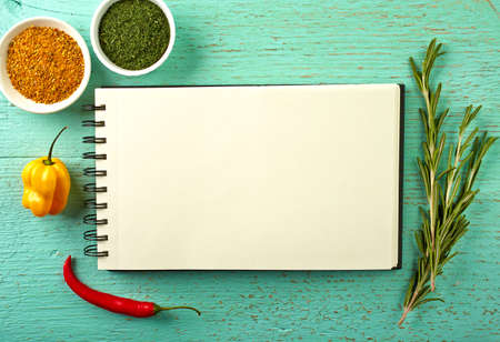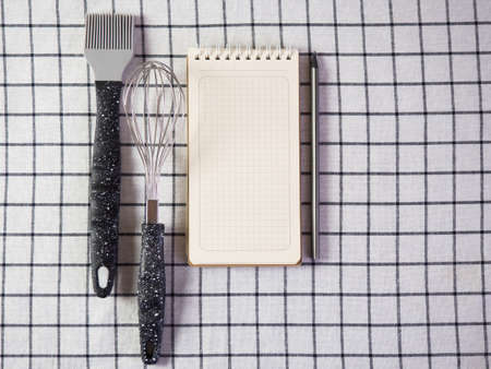 kitchen towel with blank cookbook, Empty notepad with free space for recipe text.