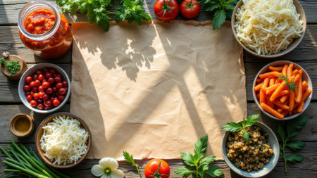 Kitchen background with baking paper, tomatoes, radish and parsley