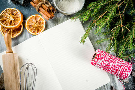 Empty cookbook for Christmas recipes, on dark blue concrete background with ingredients for traditional xmas baking, top view copy space