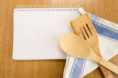 Notebook on wooden surface next a cloth and wooden kitchenware
