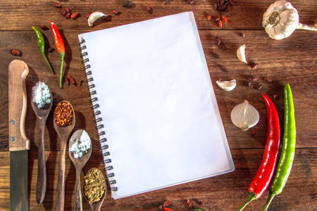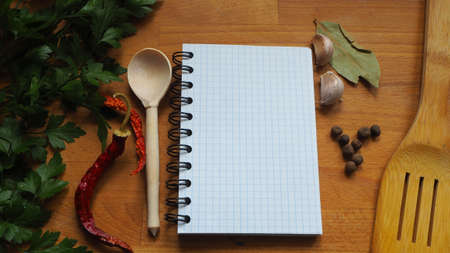 Cooking Board with Notepad on the background of a wooden spoon and spices