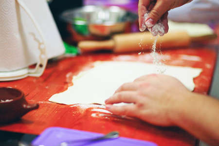 Cooking sweet Thai pancakes. A woman on the street rolls and stretches the dough straightens a close-up of her hand. traditional Asian Thai lifestyle. food for tourists, fast food street