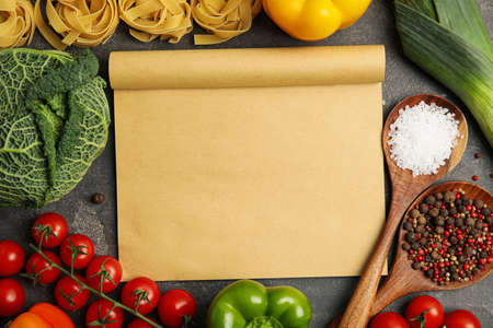 Blank sheet of paper and different fresh products on gray table, flat lay with space for text. Cooking Classes