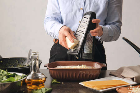 Closeup hand of chef baker making homemade pizza. Female hands rubbing cheese on pizza