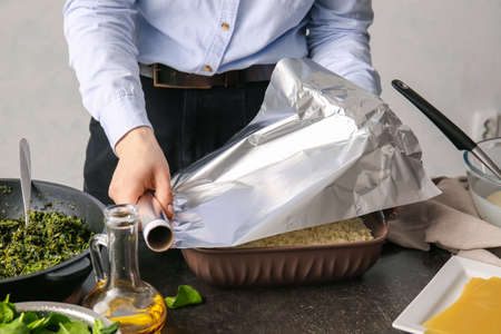 young beautiful mixed race woman spreads pastry paper on a dish in light modern kitchen