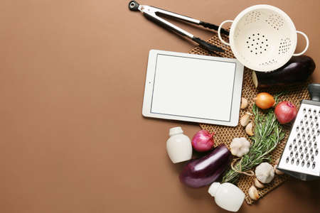 The concept of a healthy vegan diet. A clean notebook with fresh vegetables and herbs. The Concept Of Vegetarian Cooking. Flat lay.