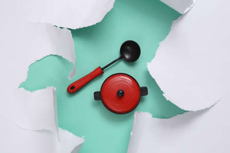 Toy ladle and pan on blue background with white torn paper. minimalism. top view