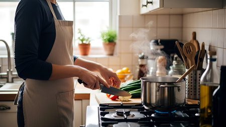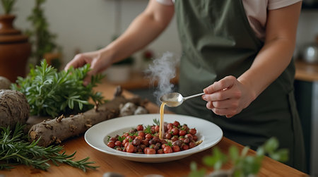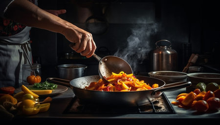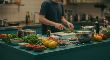 person, cooking delicious and healthy meal, with ingredients and spices visible, created with generative ai