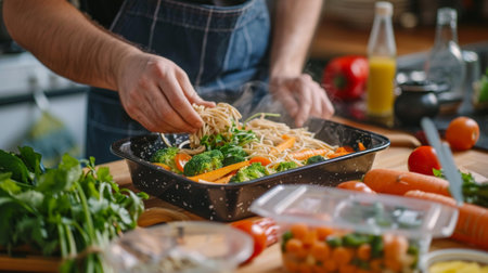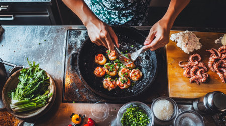A vibrant kitchen scene featuring hands cooking shrimp with fresh vegetables. The image showcases the preparation of a healthy and delicious meal, highlighting vibrant ingredients and culinary skill.