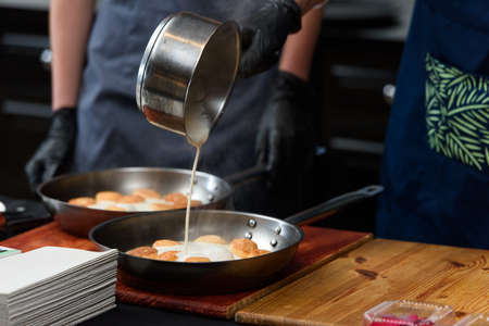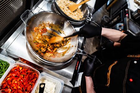 Close-up of a chefs hands in a tunic that adds salt or pepper to a dish when frying in a pan