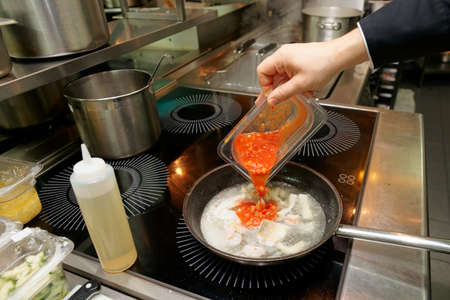 Chef is adding tomato sauce to seafood stew, work at a restaurant kitchen