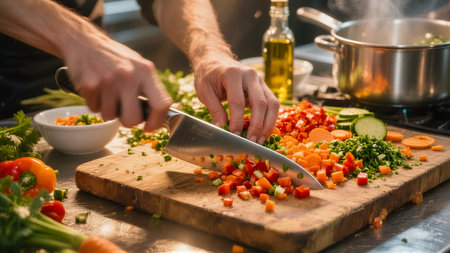 A close-up of a person's hands chopping fresh red peppers and other vegetables on a wooden cutting board in a kitchen. An open cookbook lies in the foreground, suggesting the preparation of a healthy, homemade meal.