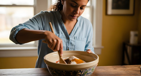 A woman mixes dry ingredients, such as flour and spices, in a ceramic bowl using a wooden spoon. The scene takes place in a kitchen, evoking a sense of homemade baking and culinary preparation.
