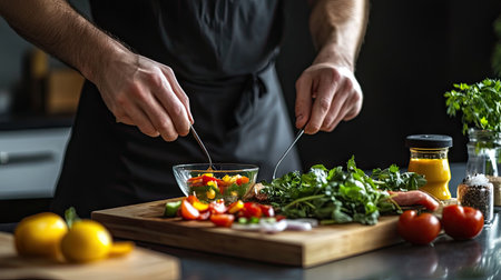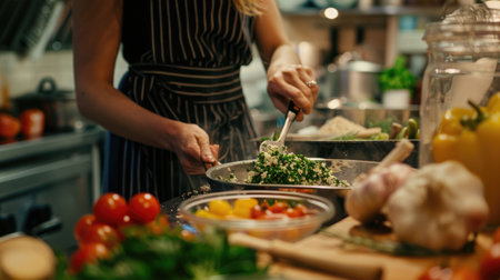 A chef skillfully prepares a vibrant vegetable salad, mixing fresh ingredients with herbs. The scene captures the essence of healthy cooking and culinary artistry.