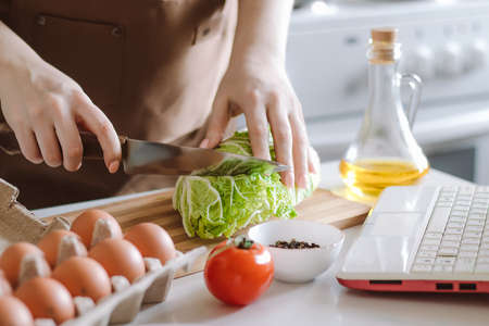 Woman prepares dietary vegetable salad at home using video recipe. Online cooking lessons, using laptop in kitchen. Record recipes on camera.