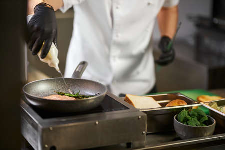 Crope view of male chefs hands, pouring olive oil on juicy cutlet with rosemary in pan. Preparation appetizing, grilled mincemeat for beef burger with ingredients on background. Concept of cooking.