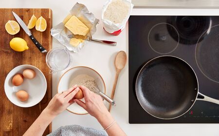 Overhead Shot Of Woman In Kitchen With Ingredients Making Pancakes Or Crepes For Pancake Day