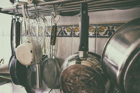vintage processing - kitchen utensils hanging in the kitchen