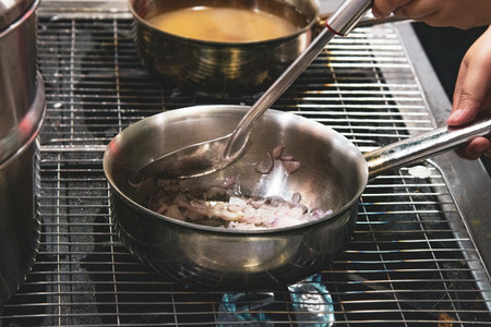 Pork meat steak fried in pan in restaurant kitchen