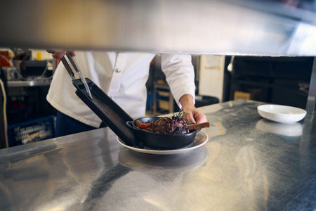 Cook puts a serving pan with meat on a plate
