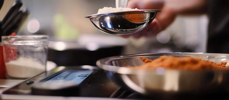 A close-up of a digital kitchen scale measuring out ingredients for a recipe. . --ar 16:7 --v 6.1 Job ID: a445ef8f-a697-4f69-a44c-1b47c792ef8e