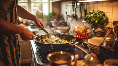 A home chef stirs a fragrant pan of fresh greens and grains, cooking a nutritious stir-fry meal in a cozy kitchen setting.