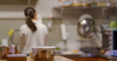 Cook or Chef using a ladle to scoop food out of pot with blurry.