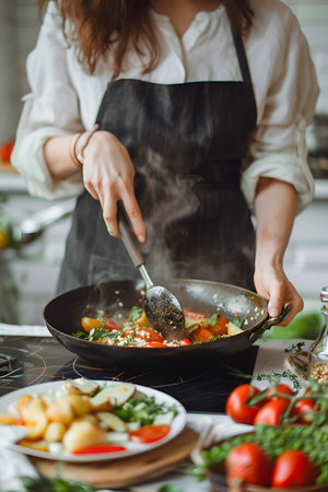 woman gracefully prepares food in her kitchen, chopping vegetables and stirring pots with precision and focus as she creates a delicious meal.
