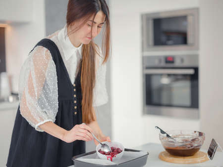 bakery, food and people concept. Woman preparing chocolate brownie at kitchen table, closeup. female cook puts cherries in sugar on a baking sheet