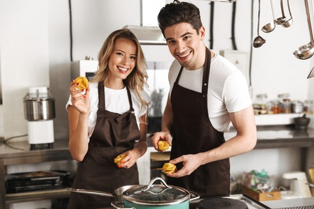 Smiling chefs couple dressed in aprons cooking together at the kitchen, preparing pasta