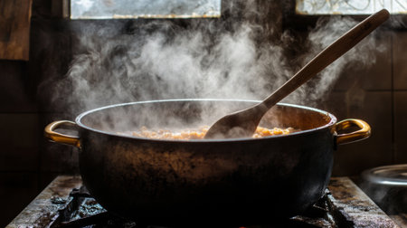 Stirring hot curry in a pot, with steam and rich spices filling the air, traditional kitchen setup