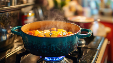 A colorful pot on a gas stove with a delicious meal being prepared, with visible ingredients and kitchen tools adding to the cooking ambiance.