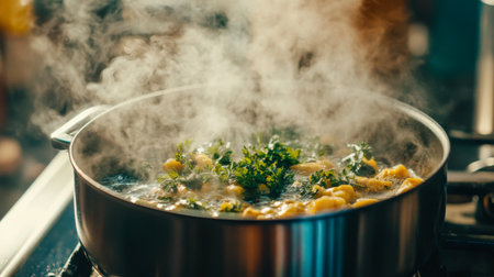 A steaming pot of freshly prepared soup with vibrant herbs and vegetables, showcasing the warmth and comfort of home cooking in a cozy kitchen setting.