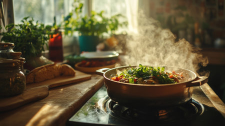 A cozy kitchen scene featuring steam rising from a pot on the stove, illuminated by natural light. Indoor plants add a touch of freshness and warmth. Ideal for culinary inspiration.