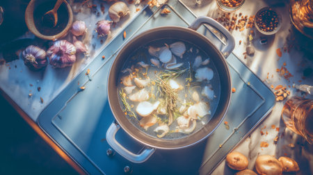 A pot filled with garlic and herbs simmers gently, surrounded by fresh ingredients and spices. This cozy kitchen scene captures the essence of cooking and flavor.