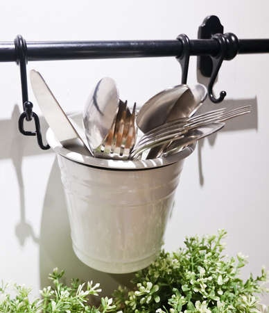 Kitchen Utensil, Cutlery Knife and Fork Spoon in A Metal Bucket.