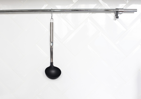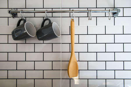 Close-up kitchen room with wooden spoon and gray coffee cup hanging on steel rail on white brick wall, interior and home decor on modern style