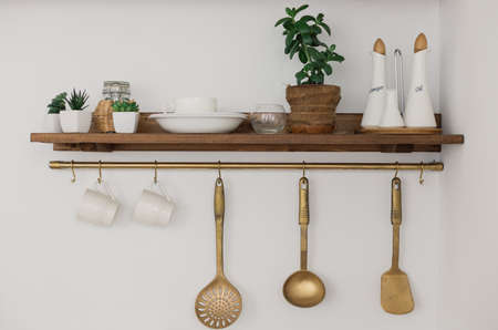Golden kitchen utensils hanging on the wall. 3d rendering