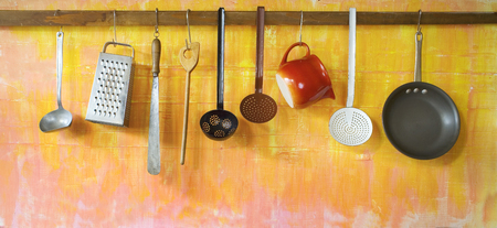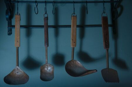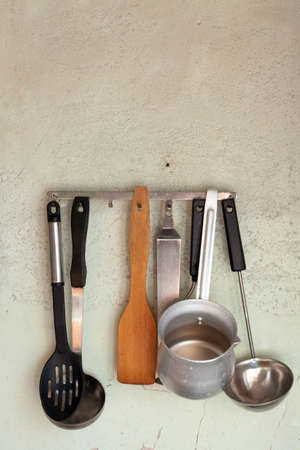 close up handy pot, spade, ladle, wooden chopping block and other kitchen equipment hanging on the wall for cooking