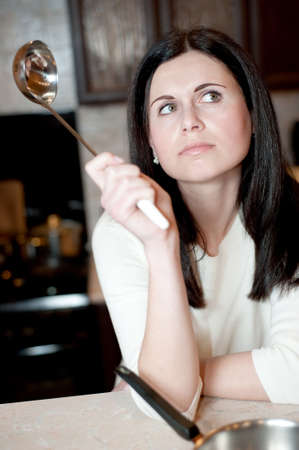 Young attractive smiling caucasian housewife in striped apron isolated on white background. Beautiful housekeeper woman tries sniffs enjoys aroma soup from black kitchen soup ladle. Delicious taste