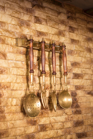 Decorative set of bronze vintage kitchen utensils hanging on a stone wall.