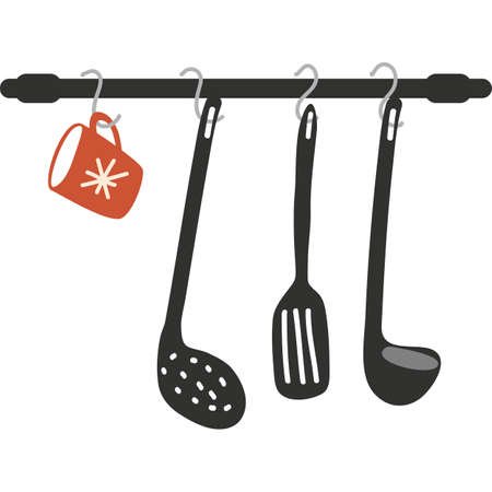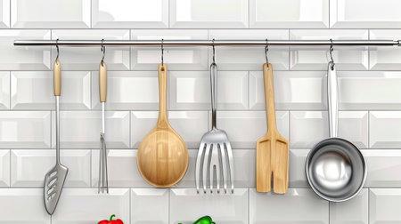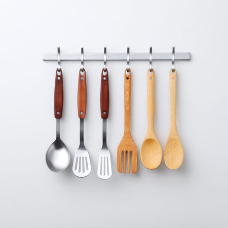 A neat arrangement of kitchen utensils including wooden and metal tools, hanging on a sleek wall hook. Ideal for culinary enthusiasts looking for organization and style.