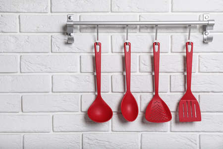 Rack with kitchen utensils hanging on white brick wall. Space for text
