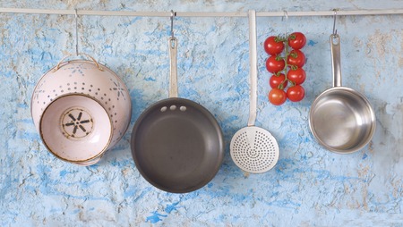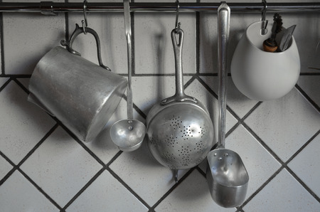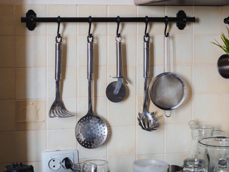 Kitchen utensils on the wall inside an apartment. Salvador, Bahia, Brazil.