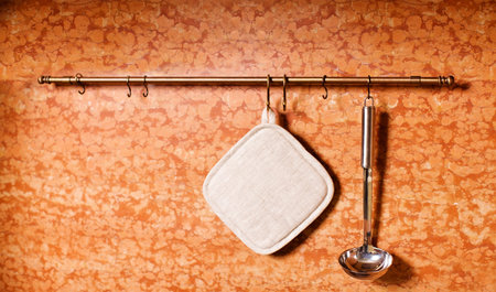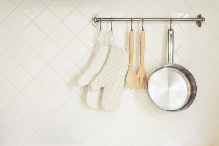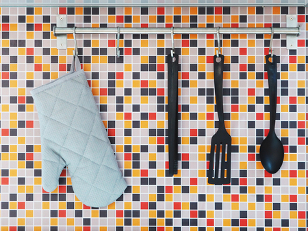 Kitchen utensil Glove and Pan with Wooden spoon Fork on Tile wall