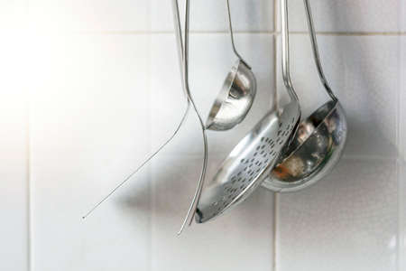Kitchen Equipment, Flippers and Ladles Hanging on The Wall, Kitchen Utensil for Frying and Cooking Meal.