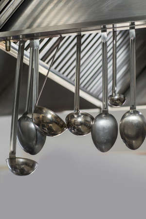 Shiny metallic serving spoons hanging on kitchen of restaurant.