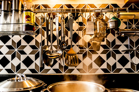 Kitchen spatulas handing on railing on a tiled wall with a blue geometric pattern in the modern designed kitchen room in a Scandinavian stayle. Kitchenware object and interior photo.