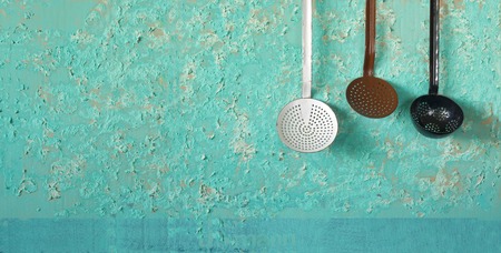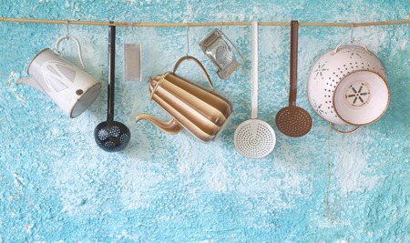 vintage set of kitchen fixtures hangs on an empty wall. A wooden spatula weighs between the metal tools